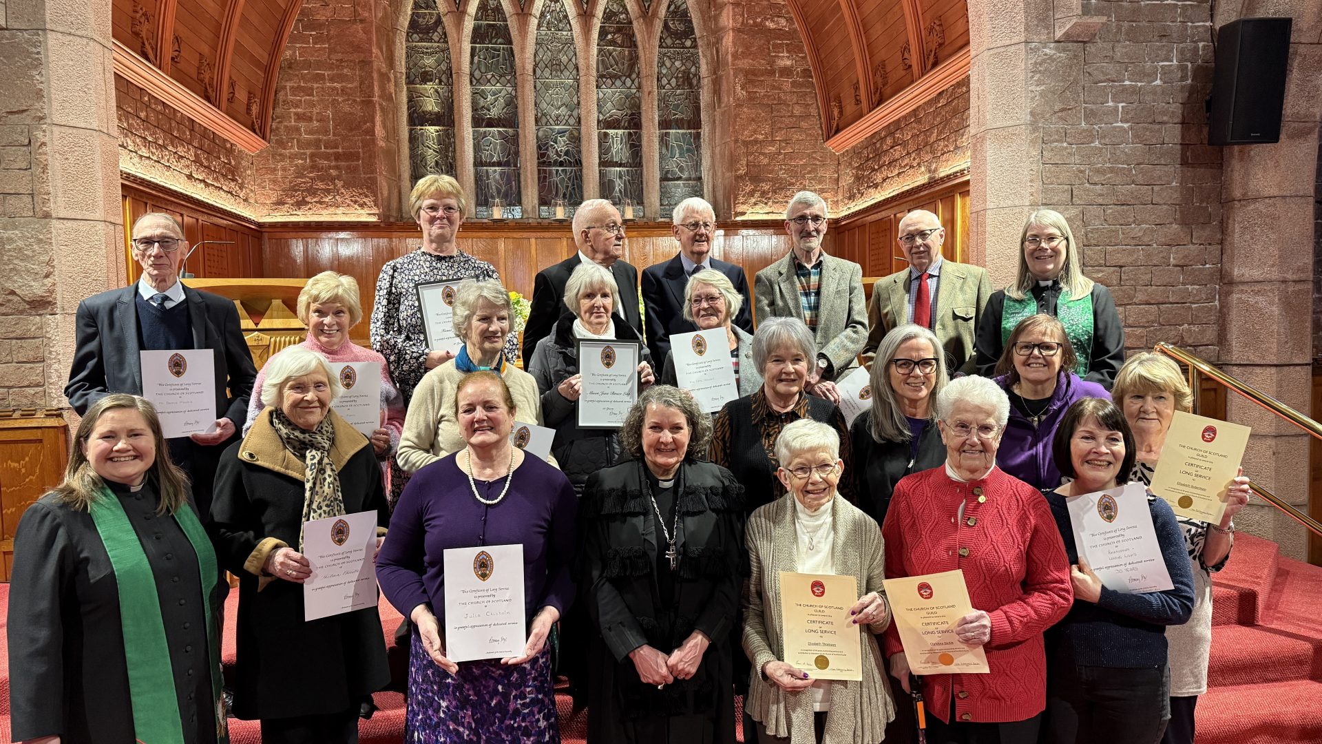 The Moderator of the General Assembly of the Church of Scotland, Rt Rev Rosie Frew, presented Long Service Certificates to 25 elders, Sunday school teachers and Guild members along with a drama group from 9 congregations.