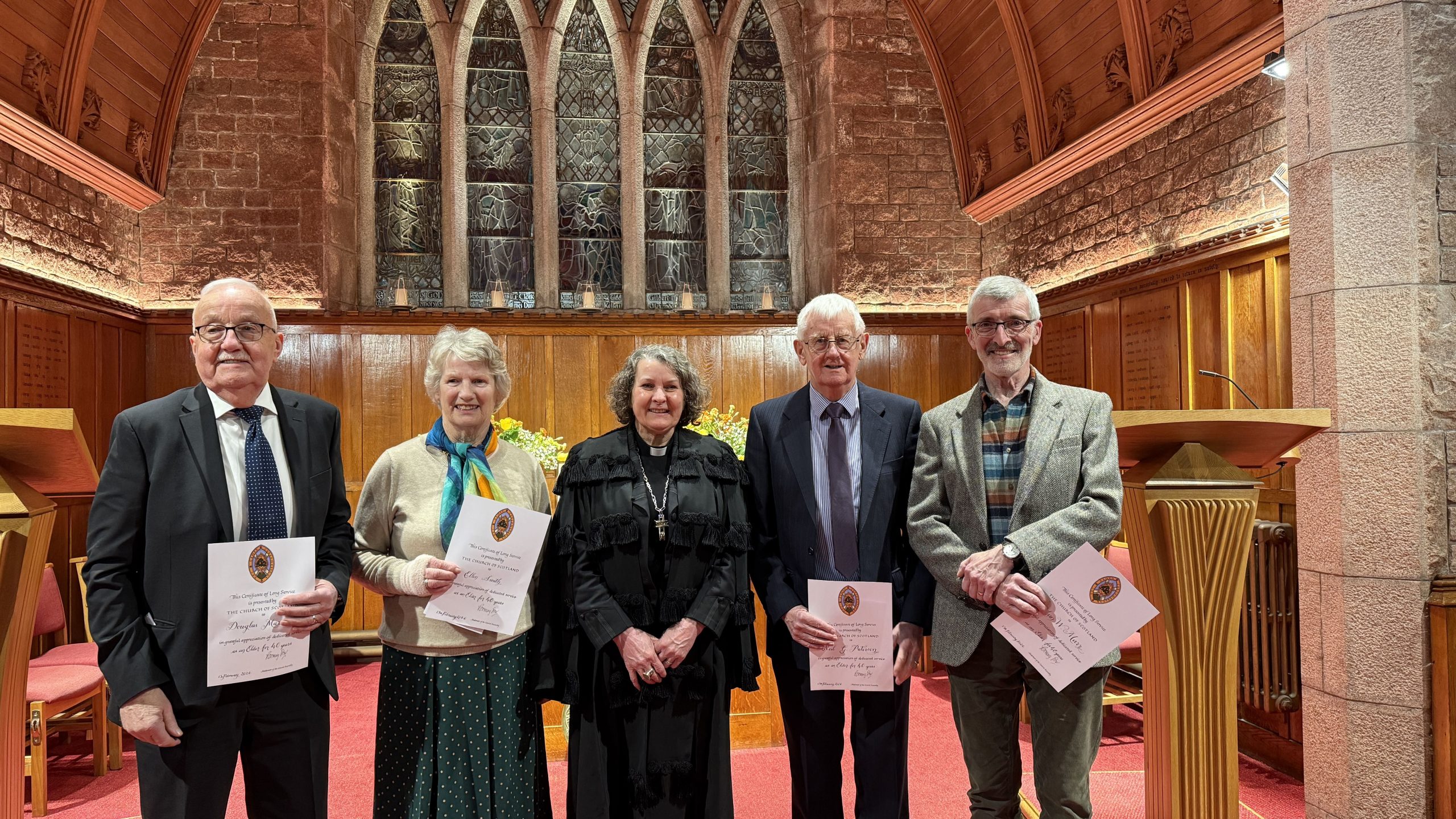 Aberdeen Mannofield (L-R): Mr Doug Marnoch (Elder, 40 years), Ms Ellen Smith (Elder, 40 years), Rt Rev Rosie Frew (Moderator of the General Assembly), Mr Neil Paterson (Elder, 40 years), Mr Alan Marr (Elder, 40 years).