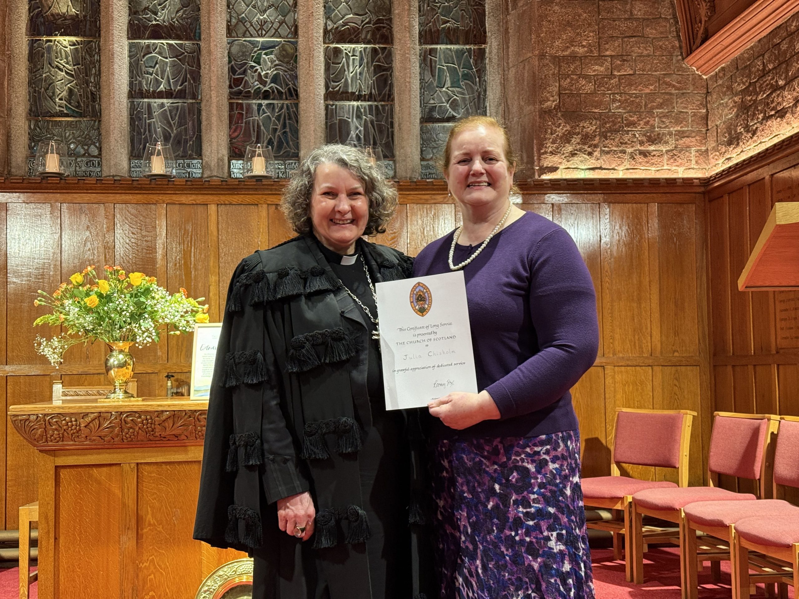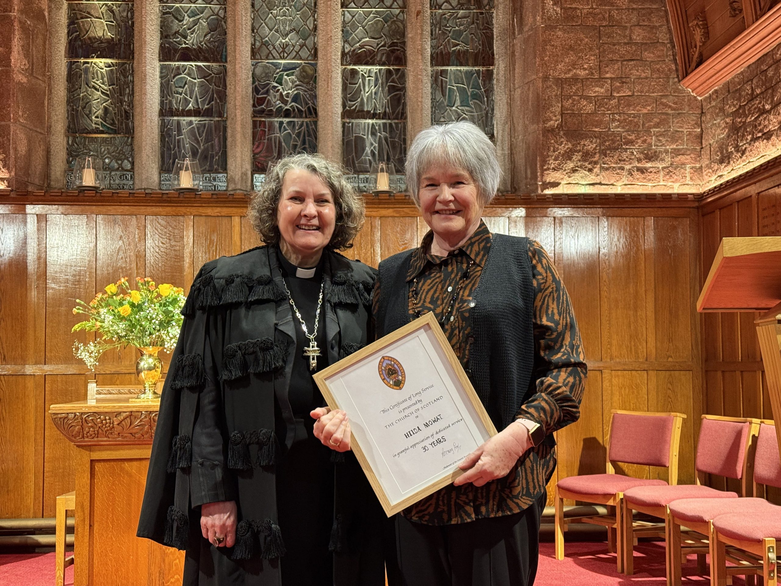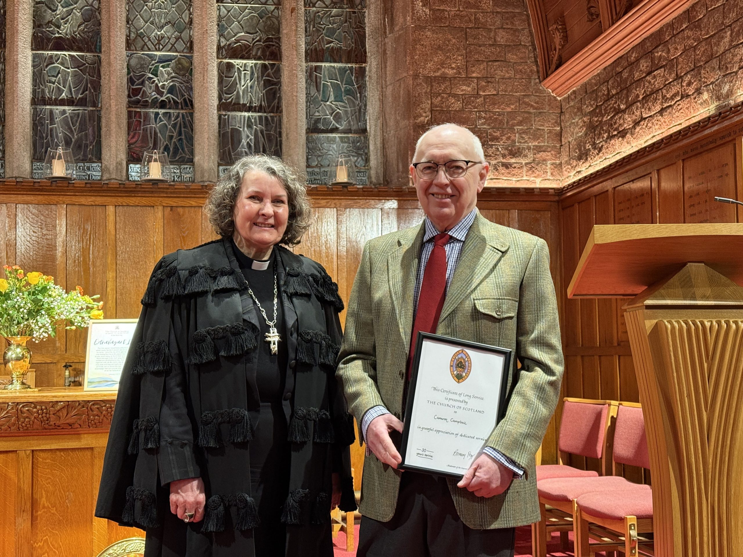 Aberdeen St Machar's Cathedral (L-R): Rt Rev Rosie Frew (Moderator of the General Assembly), Mr Cameron Campbell (Elder, 30 years).
