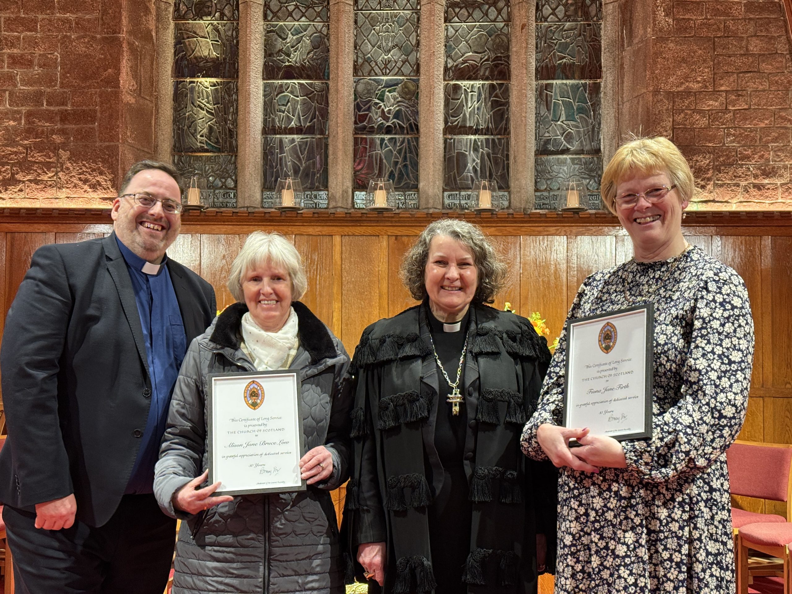 Aberdeen Devana (L-R): Rev Peter Johnston, Mrs Alison Low (Elder, 30 years). Rt Rev Rosie Frew (Moderator of the General Assembly), Mrs Fiona Firth (Elder, 30 years).